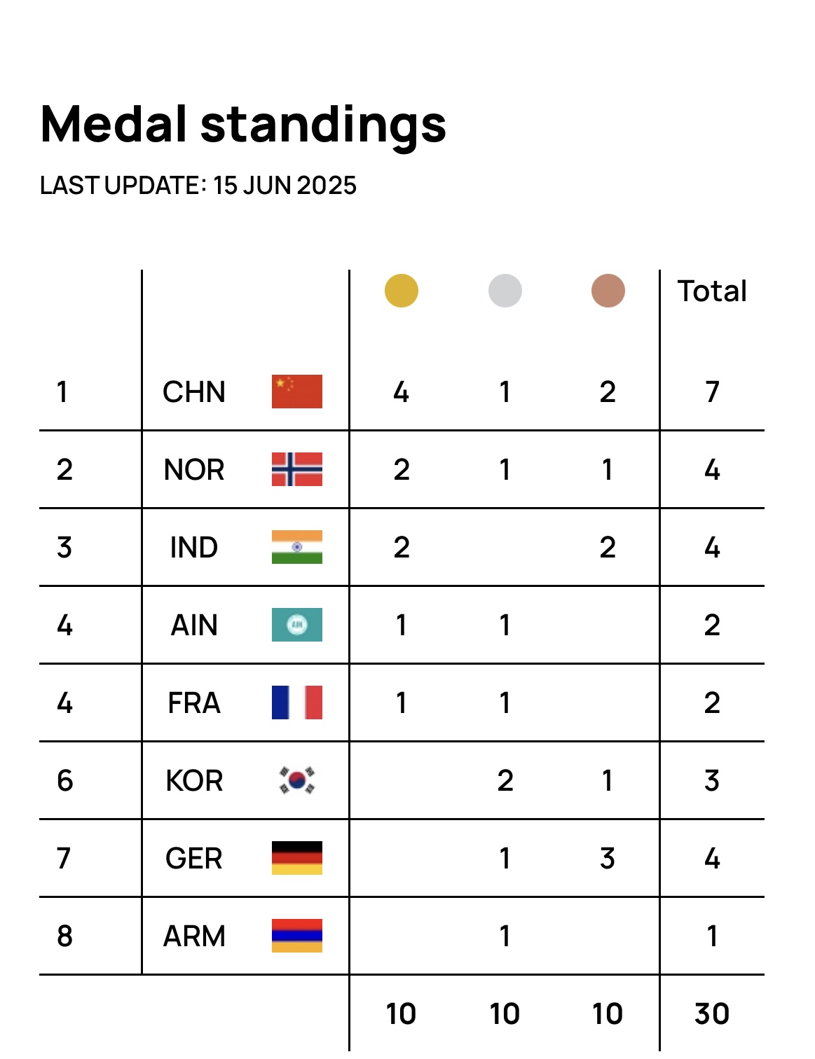 最終,中國(guó)隊(duì)以4金1銀2銅共7枚獎(jiǎng)牌的成績(jī)結(jié)束了本站世界杯,在金牌榜和獎(jiǎng)牌榜均排名首位。