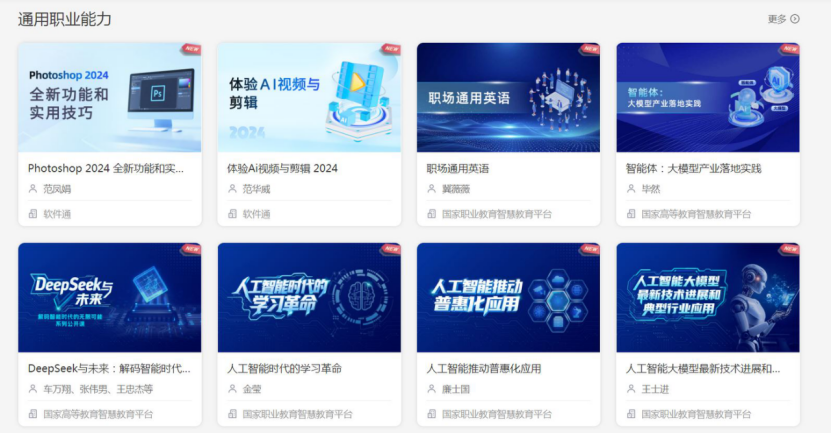 打開國家智慧教育平臺,進入終身教育智慧教育平臺,點擊崗位勝任力專題,“職場通用英語”“新手教師訓練營”等課程映入眼簾;人工智能專題中,可以學習“人工智能入門”“智能體概述及搭建”等課程……