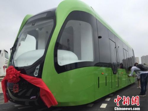 圖為全球首列虛擬軌道列車。 魯毅 攝