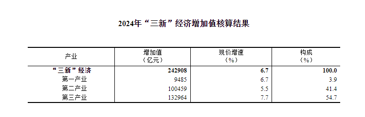 據(jù)國(guó)家統(tǒng)計(jì)局消息,經(jīng)核算,2024年我國(guó)“三新”經(jīng)濟(jì)增加值為242908億元,比上年增長(zhǎng)6.7%(按現(xiàn)價(jià)計(jì)算),比同期國(guó)內(nèi)生產(chǎn)總值(GDP)現(xiàn)價(jià)增速高2.5個(gè)百分點(diǎn);占GDP的比重為18.01%,比上年提高0.43個(gè)百分點(diǎn)。