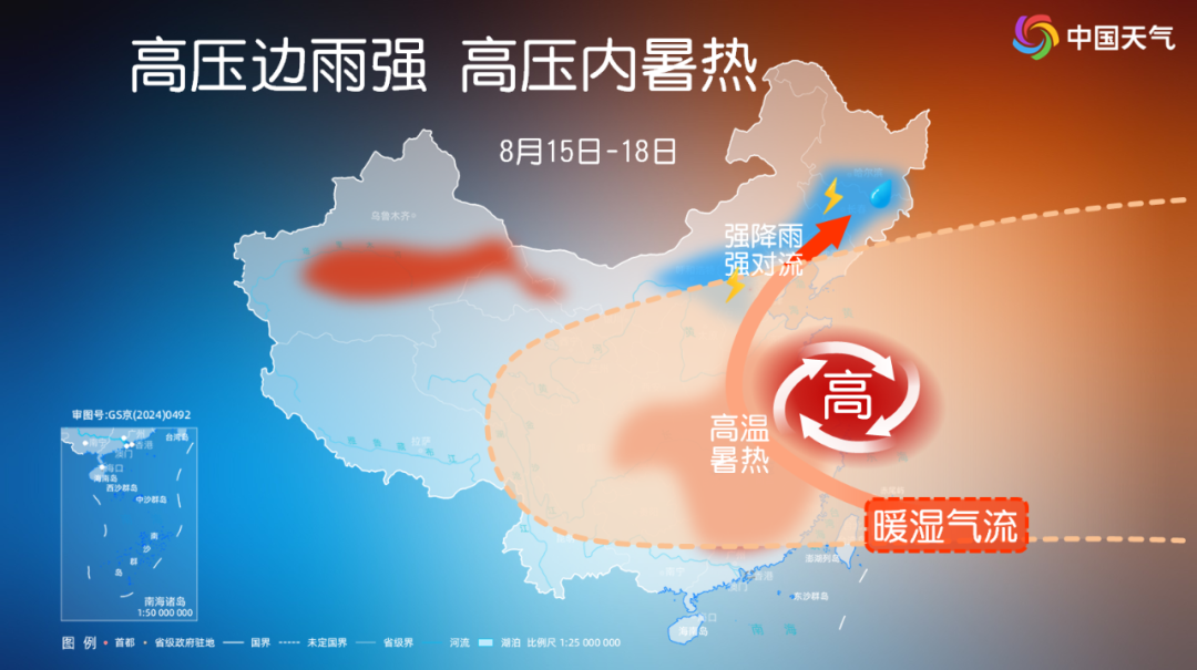 在副熱帶高壓邊緣的華南、西南地區東部以及副高北側的華北、東北等地則是多降雨,但不下雨的時候也會比較悶熱。