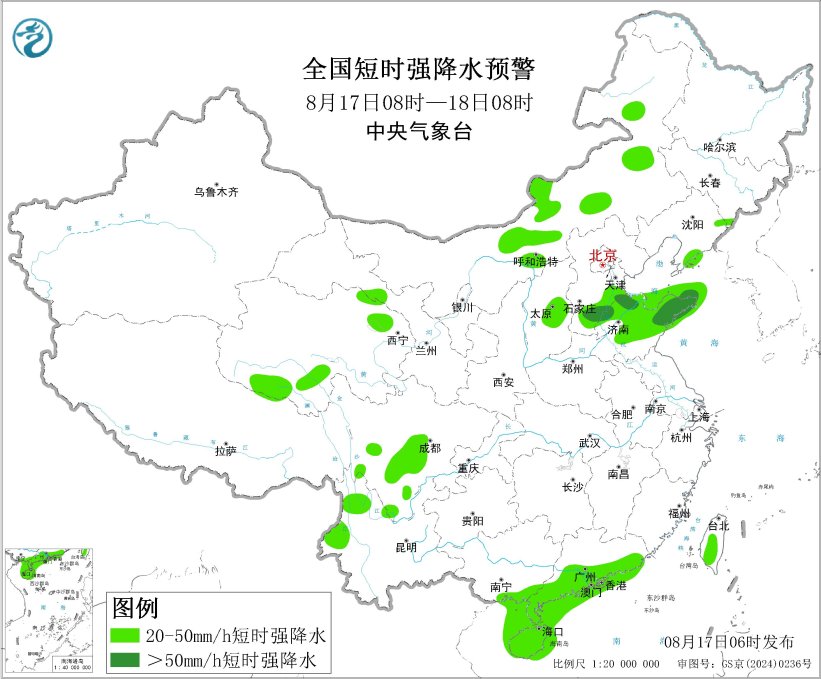 預計,8月17日8時至18日8時,內蒙古中東部、山西東南部、河北南部、山東中北部、青海中北部、四川盆地西部、廣西東南部沿海、廣東南部沿海、海南島、臺灣島南部等地部分地區有大到暴雨,其中,廣東西南部沿海等地局地有大暴雨(100~150毫米)。上述部分地區伴有短時強降水(最大小時降雨量20~50毫米,局地可超過70毫米),局地有雷暴大風等強對流天氣。
