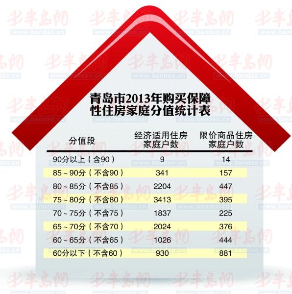 為了保證申請家庭能選到合適的房源,11月26日,市住房保障中心還公布了青島市2013年購買保障性住房家庭分值統計表,申請家庭可以根據統計表準確定位申請房源。根據統計表,本市經適房家庭用戶90分以上共有9戶,限價房家庭共有14戶;85~90分中,經適房家庭共341戶,限價房家庭共157戶。