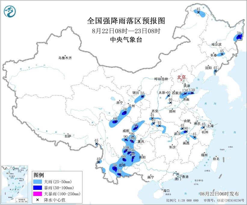 預(yù)計(jì),8月22日8時(shí)至23日8時(shí),黑龍江西北部和東部、吉林中部、遼寧東部、青海東南部、甘肅中南部、寧夏中部、陜西南部、山西東部、山東北部、湖北東部和西部、江西北部、川西高原北部、四川盆地中西部和南部、貴州西部、云南中東部和西南部等地部分地區(qū)有大到暴雨,其中,山東北部、四川盆地南部、云南東北部等地局地有大暴雨(100~180毫米)。上述部分地區(qū)伴有短時(shí)強(qiáng)降水(最大小時(shí)降雨量20~50毫米,局地可超過70毫米),局地有雷暴大風(fēng)等強(qiáng)對(duì)流天氣。