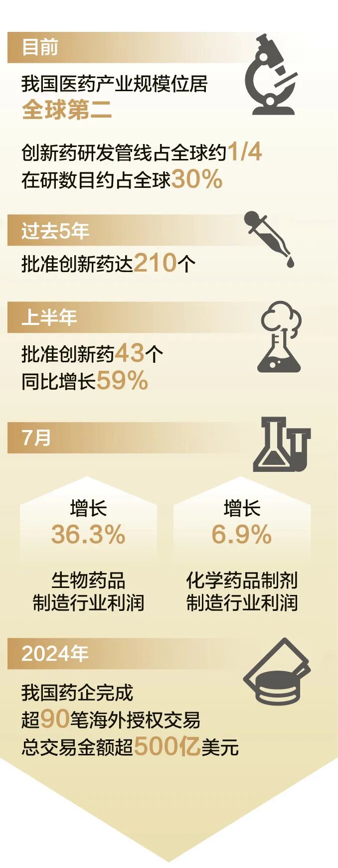 9月1日啟動的2025年“全國藥品安全宣傳周”傳遞出的信息表明,醫藥產業創新發展良好:過去5年,我國共批準創新藥210個,保持加速增長態勢。目前,我國在研創新藥約占全球30%。