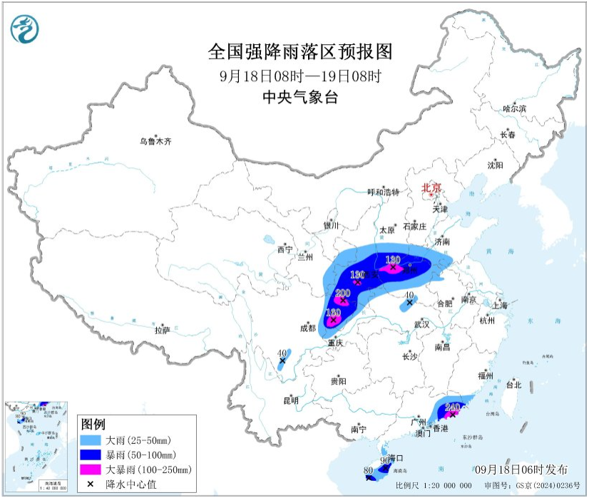 中央氣象臺9月18日06時繼續發布暴雨黃色預警:預計,9月18日08時至19日08時,甘肅東南部、陜西中南部、山西南部、四川盆地中東部、重慶西部、湖北北部、河南中北部、山東西南部、福建南部、廣東東部和西南部沿海、海南島等地部分地區有大到暴雨,其中,陜西南部、河南西部、四川盆地東部、廣東東南部沿海等地部分地區有大暴雨(100~240毫米)。上述部分地區伴有短時強降水(最大小時降雨量20~50毫米,局地可超過70毫米),局地有雷暴大風等強對流天氣。