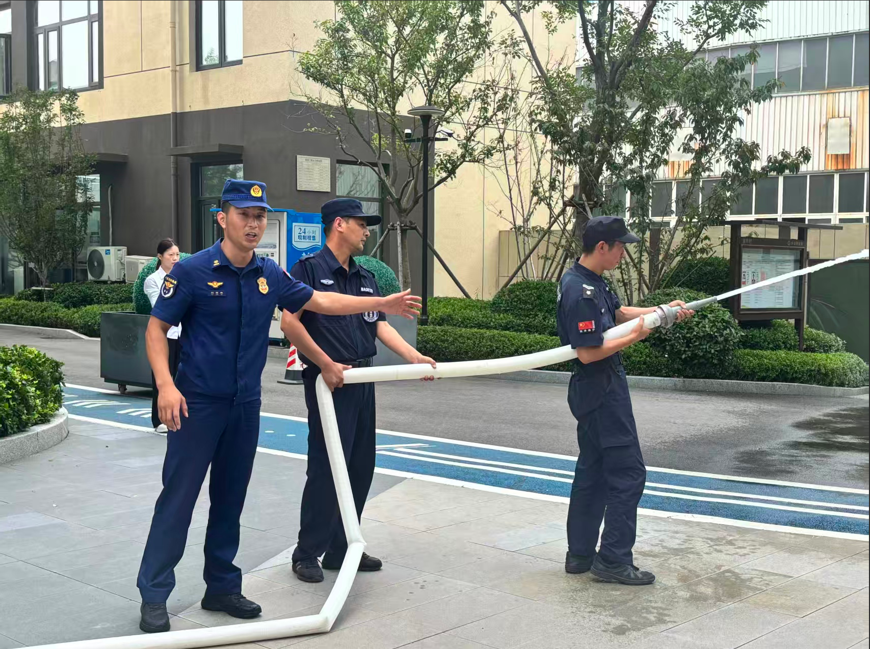 宣傳人員手把手指導物業保安使用水槍滅火。