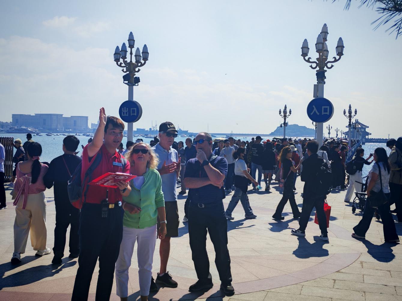 青島國際郵輪港區服務管理局聯合交警部門與地接旅行社建立實時工作對接機制,優化發車時序安排,在廣西路中山路交叉口、福山支路、曲阜路等重點路段增派警力、給予保障支持,讓游客出行更加順暢。郵輪母港推行“零待時24小時在崗”機制,協同船方安保落實安檢、查驗、指引全流程服務,滿足郵輪“過夜停留”需求,確保旅客無論清晨登船、深夜離港,都能享受到順暢無虞的體驗。同時,完善郵輪母港外卡取現、貨幣兌換等金融服務,為游客提供24小時全天候登離船服務保障。聯合大鮑島街區運營方、地接旅行社設置“母港—街區”擺渡巴士,為自由行游客提供循環接送專屬服務。在歷史城區提供專業英語導覽、便捷外卡支付、外幣兌換等保障措施。