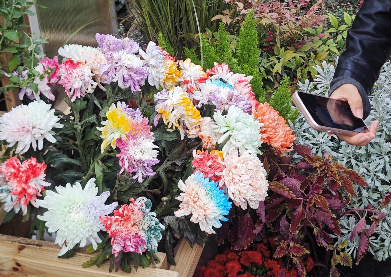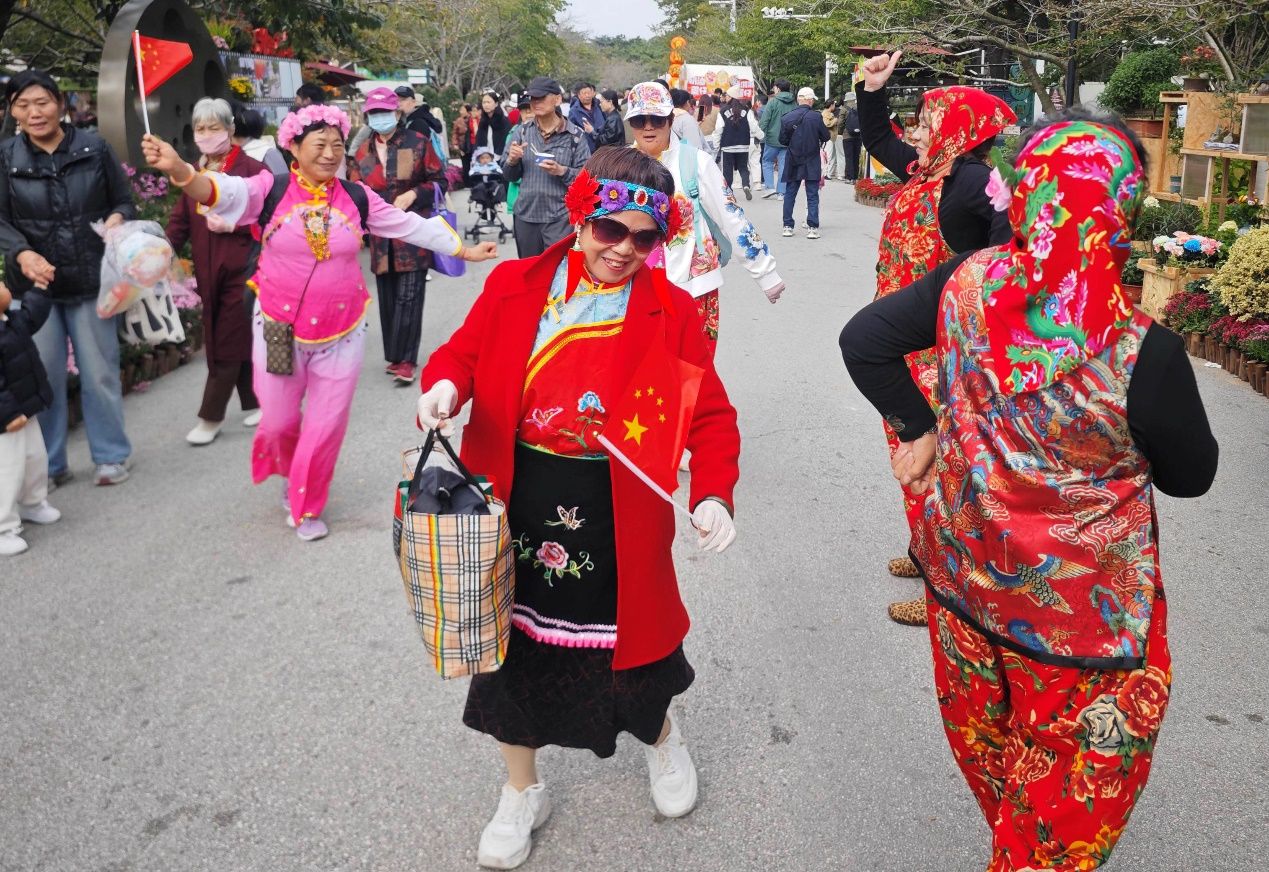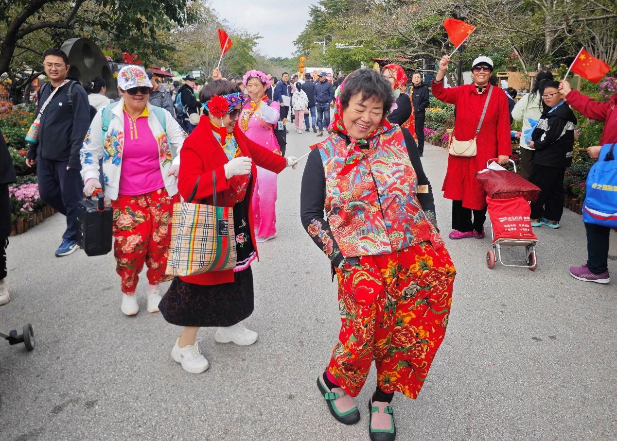 記者在現(xiàn)場看到,園區(qū)內(nèi)菊花在寒風(fēng)中競相綻放,黃的似金、白的如雪、粉的若霞,造型各異的菊藝景觀引得游客紛紛駐足。游客或舉著手機(jī)與菊花合影,或細(xì)細(xì)端詳花瓣紋路。廣場上,更有自發(fā)組織的舞蹈隊伴著歡快旋律翩翩起舞,紅色舞衣與各色菊花相映成趣,成為現(xiàn)場一道亮眼風(fēng)景。