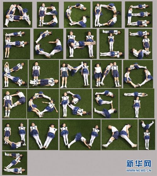 6月20日,陜西漢中洋縣華盛幼兒園大班的小朋友擺出英文字母造型拍攝創意畢業照(拼版照片)。新華社發(王川源 攝)