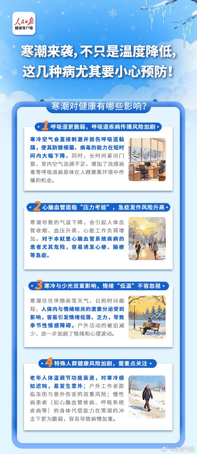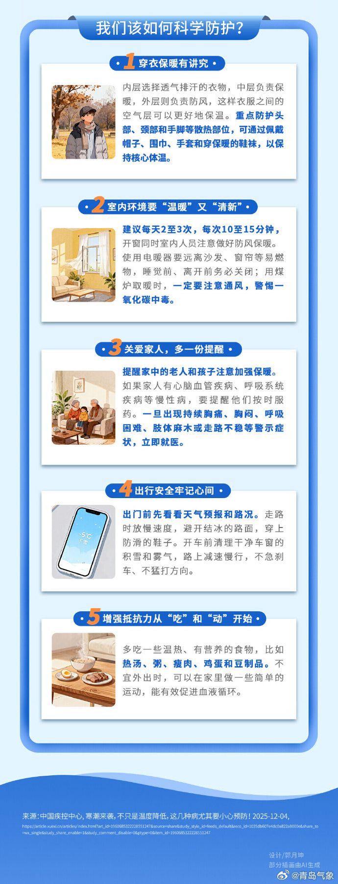12月13日,青島市氣象局發(fā)布提醒:今天白天,青島持續(xù)受寒潮天氣影響,氣溫繼續(xù)下降。預(yù)計(jì)今天夜間到明天早晨,島城將迎來寒潮影響期間的氣溫最低點(diǎn),沿海一帶最低氣溫在-3~-2°C,內(nèi)陸地區(qū)在-6°C。積雪融化也會(huì)帶走空氣中的部分熱量,這個(gè)周末天氣寒冷,外出的朋友要做好保暖工作,手套圍巾也要戴起來!另外,寒潮來襲不只是氣溫降低,有幾種病也要小心預(yù)防。