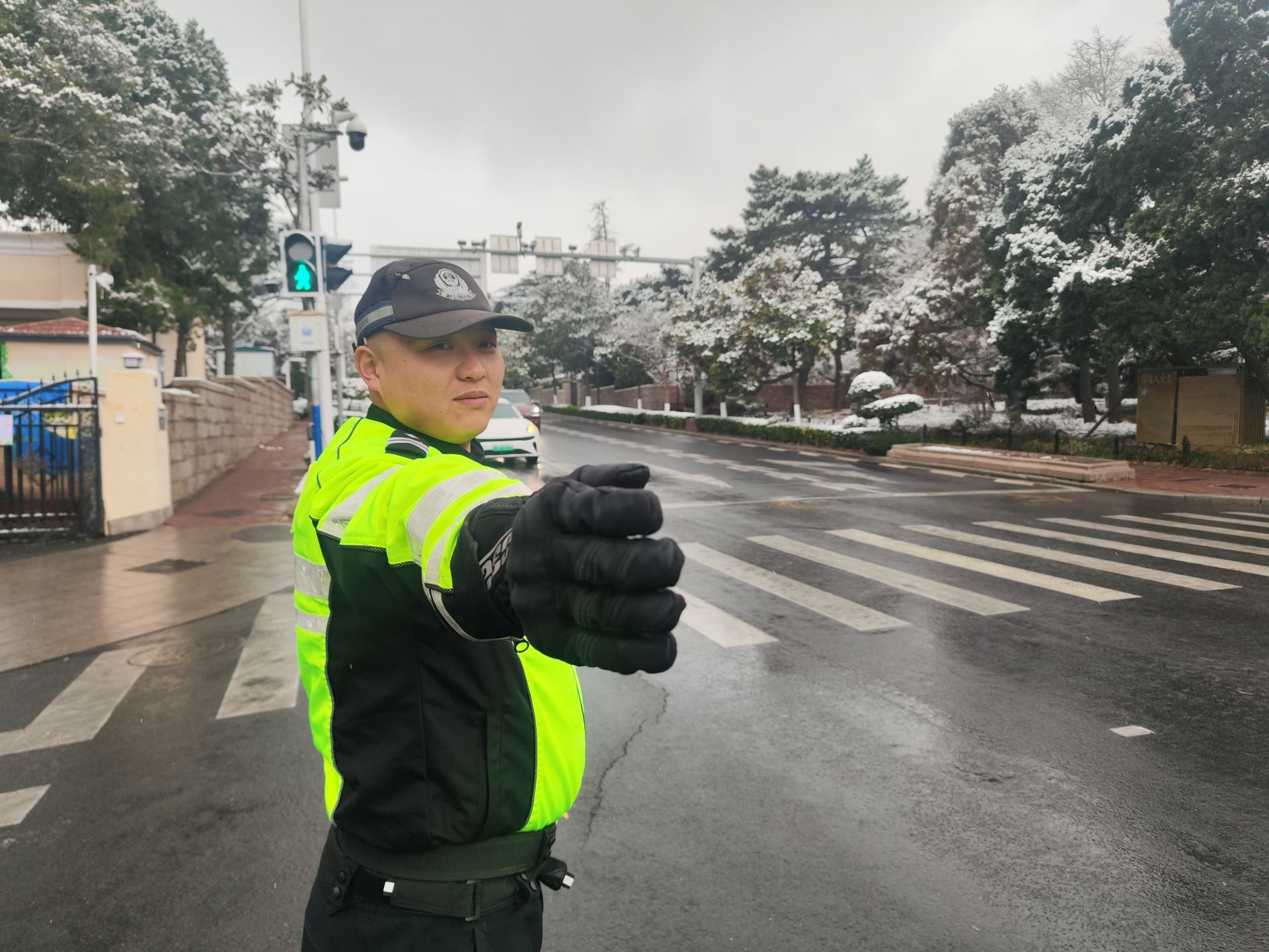 市南交管溫馨提示:雪天駕車請減速慢行、保持安全車距,行經橋梁高架等易結冰路段需平穩通過;行人應選防滑路面行走,遠離大型車輛盲區及轉彎半徑區域,確保出行安全。