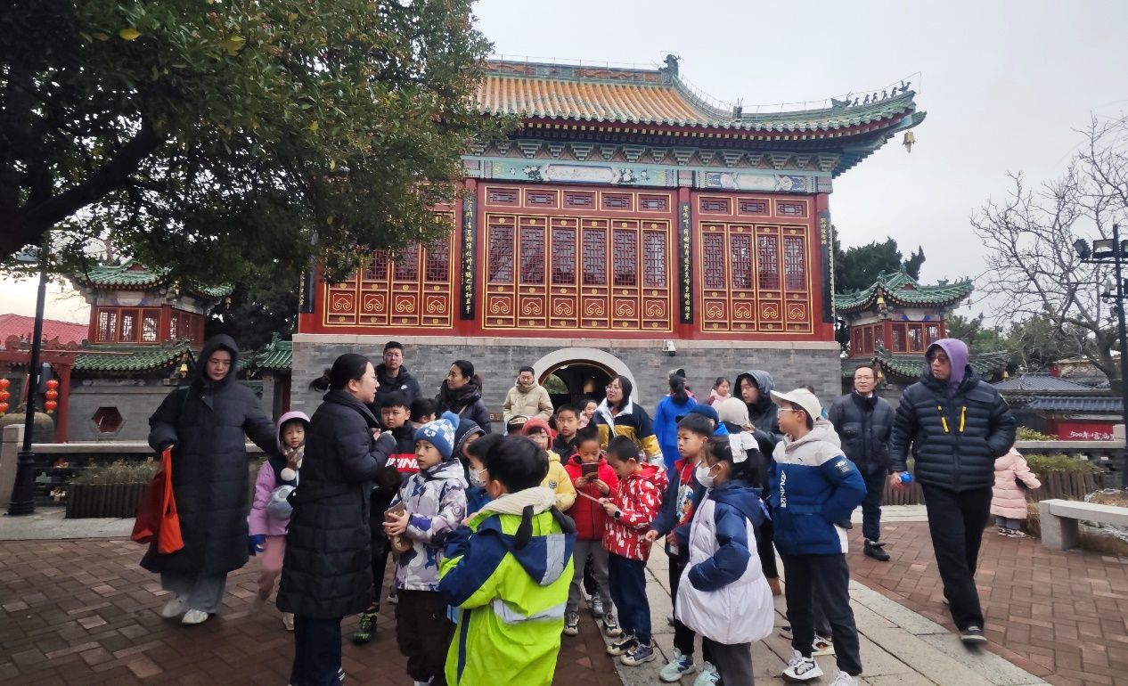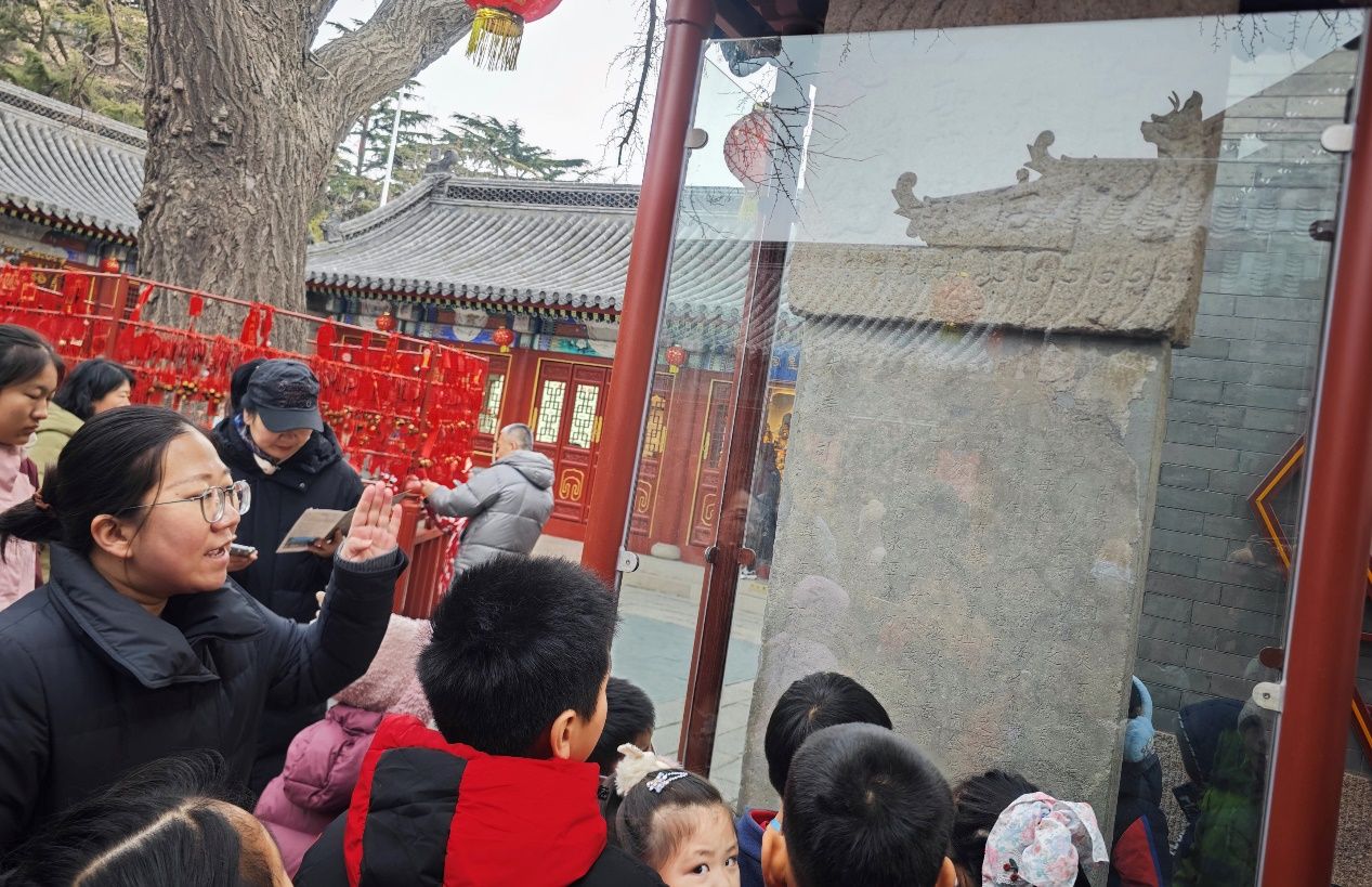 穿過(guò)前院,一座精巧的門(mén)牌樓映入眼簾,讓小記者紛紛駐足。“這座牌樓寬3.5米、高5.5米,集屋頂、梁枋、斗拱等古建筑核心構(gòu)件于一體,堪稱(chēng)古建筑‘活標(biāo)本’。”楊易表示,“它不僅是裝飾,更承載著中華民族的文化傳統(tǒng)。”門(mén)牌樓前一對(duì)石獅昂首挺胸、神態(tài)威嚴(yán),小記者或撫摸石獅感受工匠技藝,或提筆記錄,還有的用相機(jī)定格這份歷史的韻味。