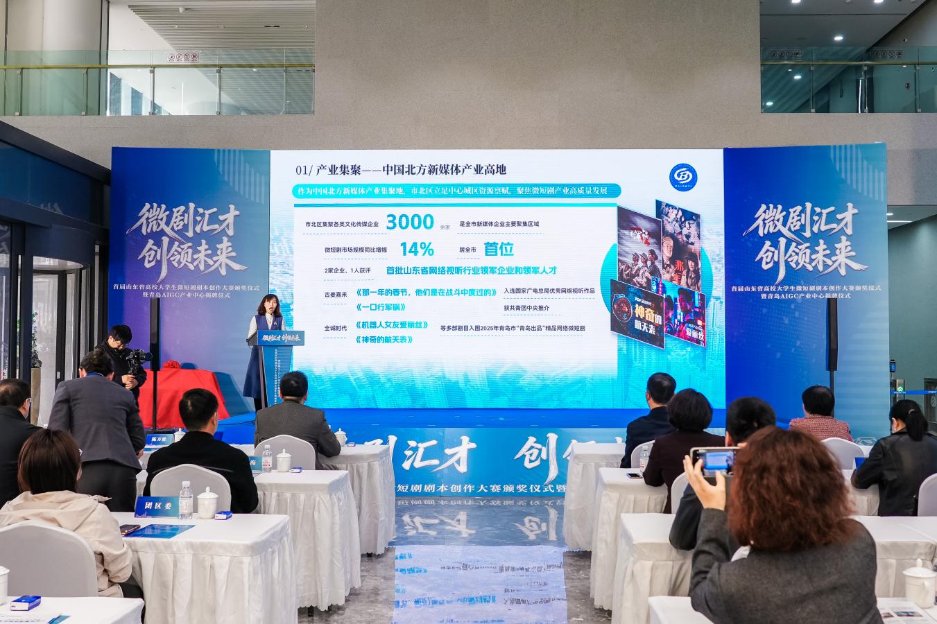 3月27日,“微劇匯才 創領未來”首屆山東省高校大學生微短劇劇本創作大賽頒獎儀式暨青島AIGC產業中心揭牌儀式在浪潮青島大數據產業園成功舉辦。省、市、區相關領導及部分駐魯高校師生代表、重點新媒體企業代表等100余人出席活動。