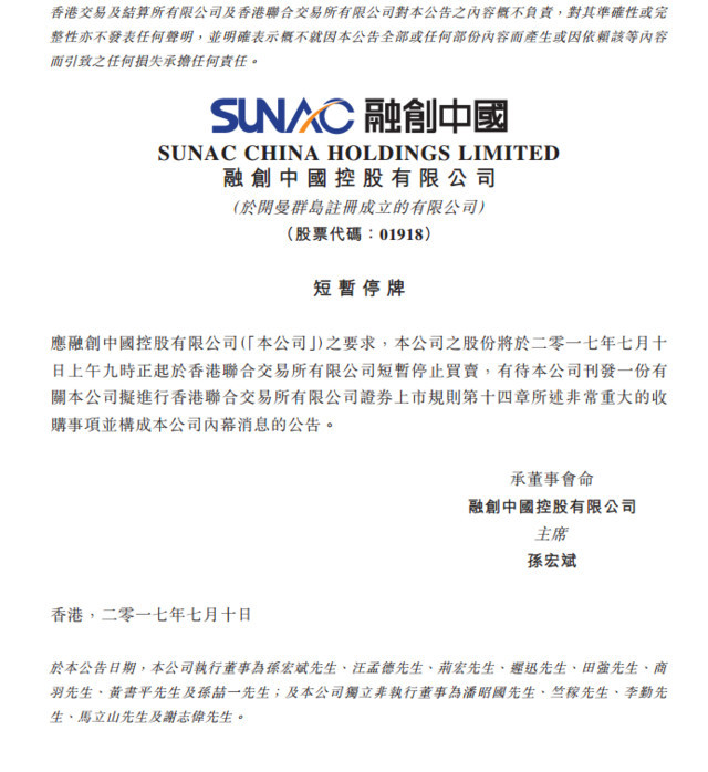 今日早間,據港交所公告,融創中國將于今天上午9點起短暫停止買賣。因此,與該公司有關的所有結構性產品亦將同時短暫停止買賣。