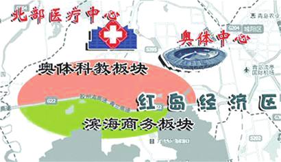 “參照編制完成的《紅島經濟區及周邊區域總體規劃》,紅島經濟區及周邊區域作為北岸城區的核心區域,將充分發揮職能帶動和模式創新作用通過文化中心、奧體中心、會議中心、軟件科技城等功能板塊的建設,培育形成城市重要的公共服務中心、科技創新中心和經濟增長極,引領紅島經濟區及周邊區域做高做新,打造科技、人文、生態新區,成為支撐‘三城聯動’的中心區之一。”