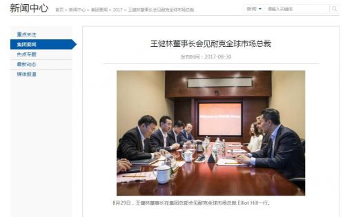 網易財經30日訊據萬達集團官網消息,8月29日,王健林董事長在集團總部會見耐克全球市場總裁Elliot Hill一行。此前,傳言稱王健林被限制出境。萬達集團28日發布聲明稱,關于王健林的傳言不實。