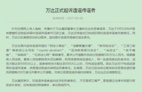 針對近期網上有人炮制、傳播關于萬達集團董事長王健林先生的惡毒謠言,萬達于9月5日向中國有管轄權法院起訴國內造謠傳謠者并已獲立案,萬達還將追究已構成犯罪的造謠傳謠者刑事責任。同時,萬達已在美國啟動訴訟程序,追究國外造謠傳謠者的違法責任。