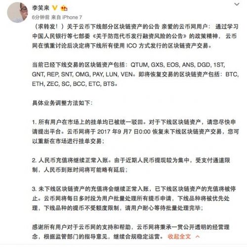 【TechWeb報道】9月6日消息,李笑來今日午間連發兩條微博,稱云幣網在慎重討論后決定將下線所有使用ICO方式發行的區塊鏈資產交易;目前公司全員恪盡職守,正積極配合監管部門工作。