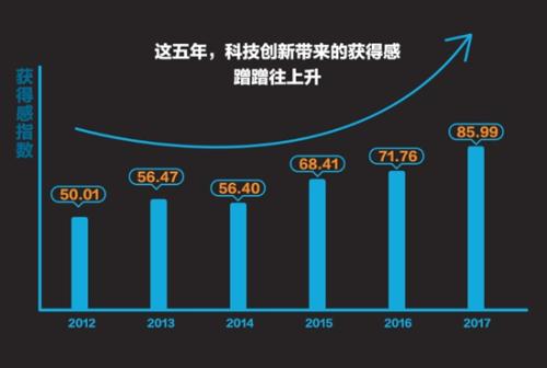 報告顯示,2012-2017年,中國人科技領域“獲得感”總得分由50.01上升至85.99,5年間增長了72%;其中,過去一年科技“獲得感”上升最快,增長約20%。這可以在過去5年我國科技成果集中爆發的高鐵、移動支付、網購、共享單車等新科技快速普及的事實中得到印證。