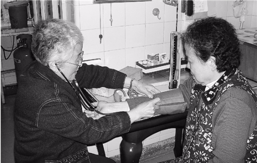 支部黨員馬慧芳給居民測(cè)血壓。