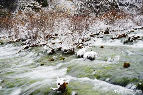 11月21日,四川九寨溝迎來入冬后的第一場降雪。紛紛揚(yáng)揚(yáng)的雪花漫漫飄落,九寨溝變得更加玲瓏剔透。圖片來源:九寨溝管理局官微