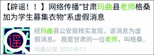 今年9月11日,甘肅省瑪曲縣公安局也通過微信公眾號對傳言進行了澄清,稱網絡傳播的“甘肅瑪曲縣老師格桑加為學生募集衣物”系虛假消息。并表示,當?shù)氐拇_有這個小學,不過學校目前一切良好,并不需要捐贈。
