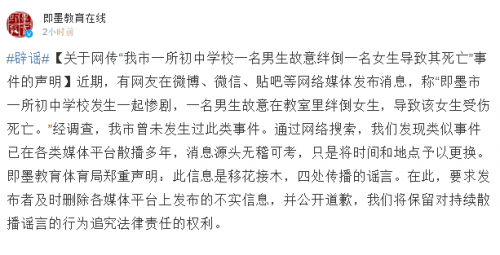 即墨市教育體育局官方微博消息,近期,有網友在微博、微信、貼吧等網絡媒體發布消息,稱“即墨市一所初中學校發生一起慘劇,一名男生故意在教室里絆倒女生,導致該女生受傷死亡。”經調查,我市曾未發生過此類事件。通過網絡搜索,我們發現類似事件已在各類媒體平臺散播多年,消息源頭無稽可考,只是將時間和地點予以更換。即墨教育體育局鄭重聲明:此信息是移花接木,四處傳播的謠言。在此,要求發布者及時刪除各媒體平臺上發布的不實信息,并公開道歉,我們將保留對持續散播謠言的行為追究法律責任的權利。