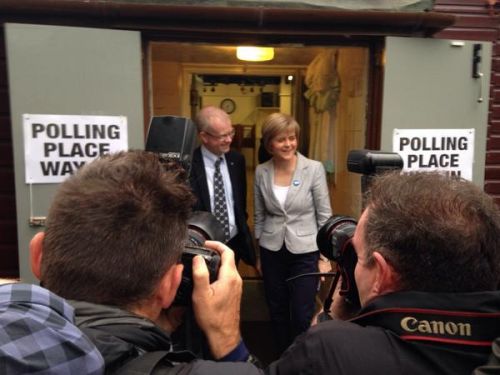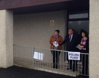 蘇格蘭首席大臣薩蒙德與另外兩位投票者在投票處合影。薩蒙德今早在其居住地就蘇格蘭獨立投下了自己的一票