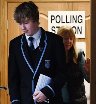 一名學(xué)生投票后離開阿伯丁的投票點。投票者中很多是年輕學(xué)生,這是十六七歲的年輕人首次有機會投票表達(dá)自己的態(tài)度