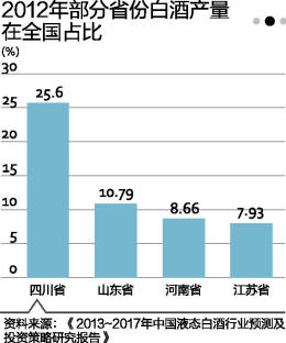 中商情報網發布的《2013~2017年中國液態白酒行業預測及投資策略研究報告》數據顯示:2012年1~12月,全國白酒的產量達115.3億升,同比增長18.55%。從各省市的產量來看,2012年1~12月,四川省白酒的產量達29.5億升,同比增長14.83%,占全國總產量的25.60%。緊隨其后的是山東省、河南省和江蘇省,分別占總產量的10.79%、8.66%和7.93%。如此大的增長比例,基本上都是中、低價位的酒被老百姓消費掉了。