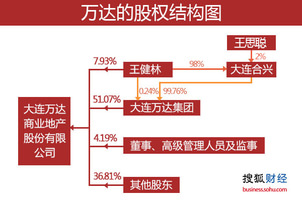 與阿里上市人們關注馬云占有多少股份一樣,萬達上市人們也關注王健林占有多少股份。上市的大連萬達商業地產股份有限公司的股東主要由四部分構成,分別是王健林7.93%、大連萬達集團51.07%、管理層持股4.19%和其他股東36.81%。而持有準備上市的大連萬達商業地產股份有限公司51.07%股份的大連萬達集團,股東分別為王健林(持股0.24%)和大連合興(持股99.76%);大連合興股東只有兩個人,王健林(持股98%)和他兒子王思聰(持股2%)。