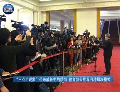 教育部部長 陳寶生:三點半現象之所以會成為年輕父母們和整個社會關注的一個難題,這是中國經濟社會發展,中國教育發展特定階段的一個產物。它有什么特點呢?就是關心這個問題的年輕父母們,他們正處在職業發展的關鍵階段,他們正處于孩子寶貝撫育的關鍵階段,這個現象表現在大中城市,他們沒有時間校后去接孩子,但是孩子到三點半就得放學,這個時間是這樣。就是三點半之前孩子是在校學習時間,這個責任是學校的。三點半之后孩子是在家生活的時間,這個責任是家長的。但是由于分工,由于作息時間的不匹配,他們沒有辦法去接孩子,所以就造成了很大的困擾,帶來了一種成長中的煩惱,發展中的困難。