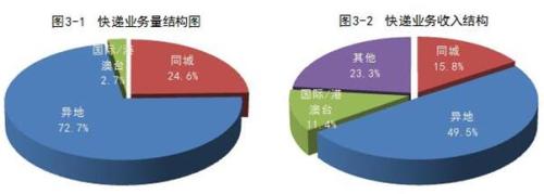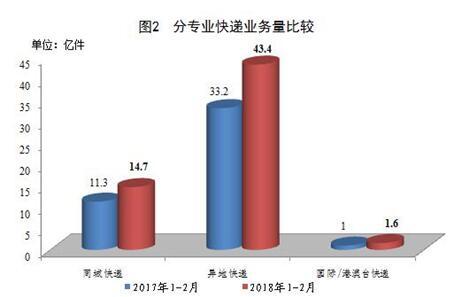 1-2月,同城、異地、國際/港澳臺快遞業務量分別占全部快遞業務量的24.6%、72.7%和2.7%;業務收入分別占全部快遞收入的15.8%、49.5%和11.4%。與去年同期相比,同城快遞業務量的比重下降0.2個百分點,異地快遞業務量的比重下降0.3個百分點,國際/港澳臺業務量的比重上升0.5個百分點。