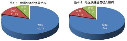 1-2月,東、中、西部地區快遞業務量比重分別為80.1%、11.9%和8%,業務收入比重分別為80%、11.1%和8.9%。與去年同期相比,東部地區快遞業務量比重下降了0.1個百分點,快遞業務收入比重下降了0.4個百分點;中部地區快遞業務量比重下降了0.1個百分點,快遞業務收入比重上升了0.1個百分點;西部地區快遞業務量比重上升了0.2個百分點,快遞業務收入比重上升了0.3個百分點。