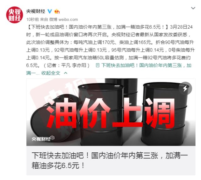 成品油年內(nèi)第三漲!加滿一箱油多花6.5元