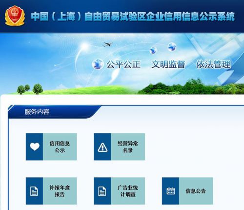 打開上海市工商局官網“中國(上海)自由貿易試驗區企業信用信息公示系統”,可以看到“信用信息公示”“經營異常名錄”等多個選項。