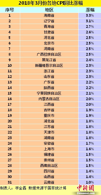 圖為各地2018年3月份CPI同比漲幅