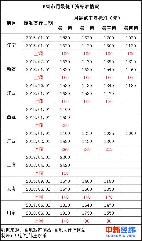 據(jù)中新經(jīng)緯不完全統(tǒng)計(jì),含山東在內(nèi),截至4月25日,已有遼寧、新疆、江西、西藏、廣西、上海、云南和山東8省市上調(diào)2018年最低工資標(biāo)準(zhǔn)。目前來(lái)看,上海月最低工資已達(dá)2420元,在各省市中最高。