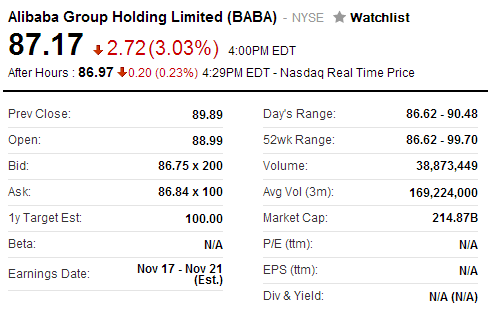 而在周二的美國股市常規交易中,阿里巴巴以89.89美元開盤,盤中走勢呈現下行,最低跌至86.62美元,最高交易價格也僅為90.48美元。最終下跌2.72美元,報收于87.17美元,跌幅為3.03%。按照收盤價計算,阿里巴巴市值為2149億美元,較首日蒸發約165億美元。