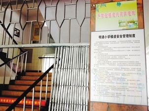 據(jù)了解,距宿舍樓不到百米的地方是小學(xué)主教學(xué)樓,一樓大廳墻上掛著《明通小學(xué)樓道安全管理制度》,規(guī)定學(xué)校要在各樓梯醒目處設(shè)置上下樓梯注意安全的警示性標(biāo)語。