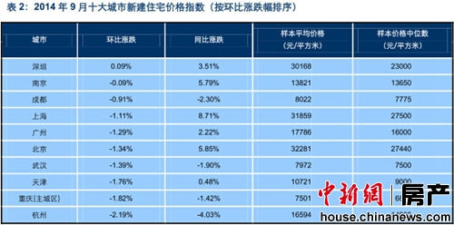 2014年9月十大城市新建住宅價格指數(按環比漲跌幅排序)