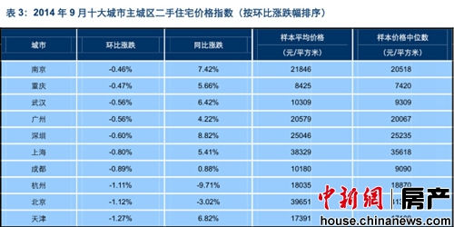 根據對十大城市主城區二手住宅的活躍樣本的調查,2014年9月,十大城市主城區二手住宅樣本平均價格為26183元/平方米,環比下跌0.84%,同比上漲2.94%。