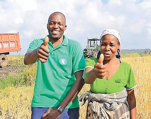 △6月18日,在莫桑比克的中非農業合作項目水稻收割現場,當地農民豎起大拇指喜迎豐收。