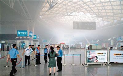 昨日15時(shí)許,廣州南站候車廳內(nèi)肯德基餐飲店空調(diào)主機(jī)冒煙。“新華視點(diǎn)”微博發(fā)