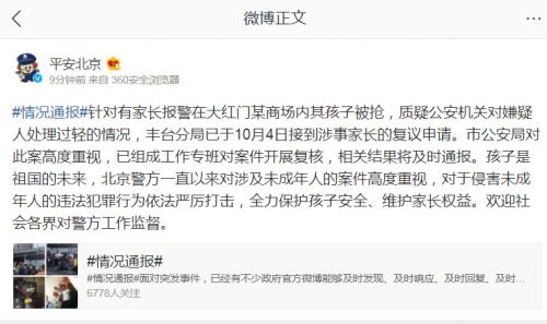 日前,網傳北京市豐臺區銀泰百貨商場發生一起疑似“搶奪嬰兒”案件。在警方處置相關警情后,受害人家屬在微博發文質疑公安機關對嫌疑人處理過輕。對此,北京市公安局官方微博@平安北京回應稱:目前,豐臺分局已于10月4日接到涉事家長的復議申請。市公安局對此案高度重視,已組成工作專班對案件開展復核,相關結果將及時通報。