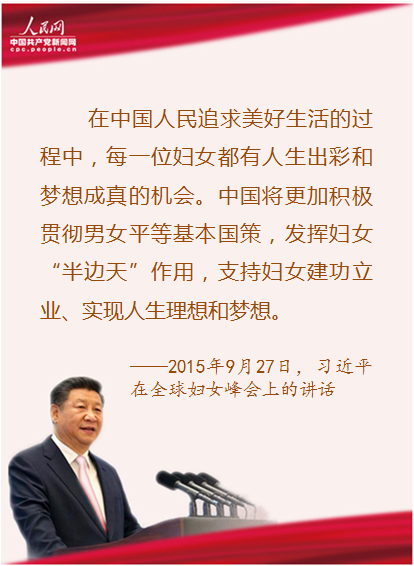 “中國將更加積極貫徹男女平等基本國策,發揮婦女‘半邊天’作用,支持婦女建功立業、實現人生理想和夢想。”黨的十八大以來,以習近平同志為核心的黨中央高度重視婦女事業,習近平總書記在不同場合多次強調發展婦女事業的重要意義,為婦女工作的開展指明了方向。