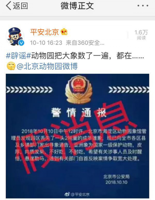 【辟謠】北京動物園和北京市公安局先后辟謠。