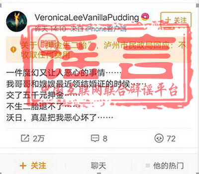 【謠言】瀘州一網民發布微博稱,其哥嫂領取結婚證時,被強制繳納5000元“二胎保證金”,并被告知“不生二胎退不了”。很快,該消息在網絡上引起軒然大波。