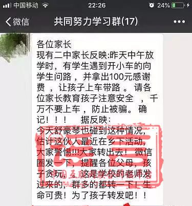 【謠言】網傳多個微信群內都出現了這樣一條信息“今天中午放學時,遇到開小車的司機向小學生問路,并拿出100元感謝費,讓小孩上車帶路后被拐”,不少家長被這條預警短信搞得有點心慌。